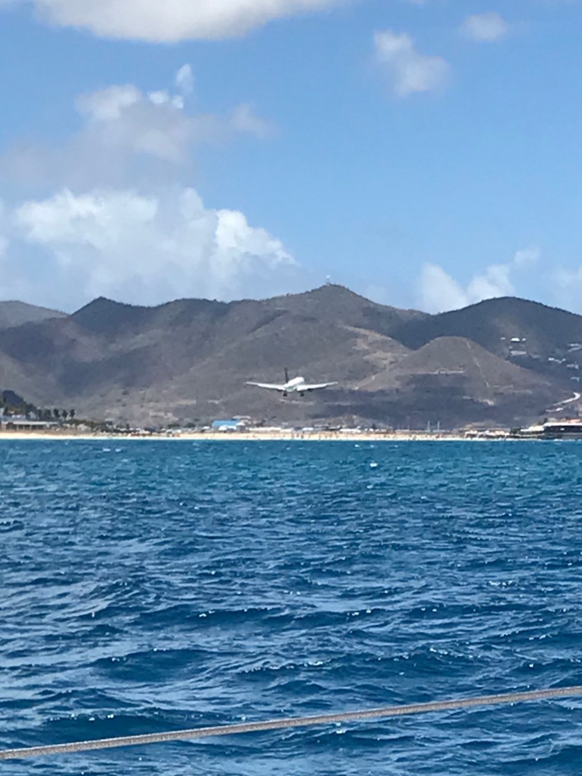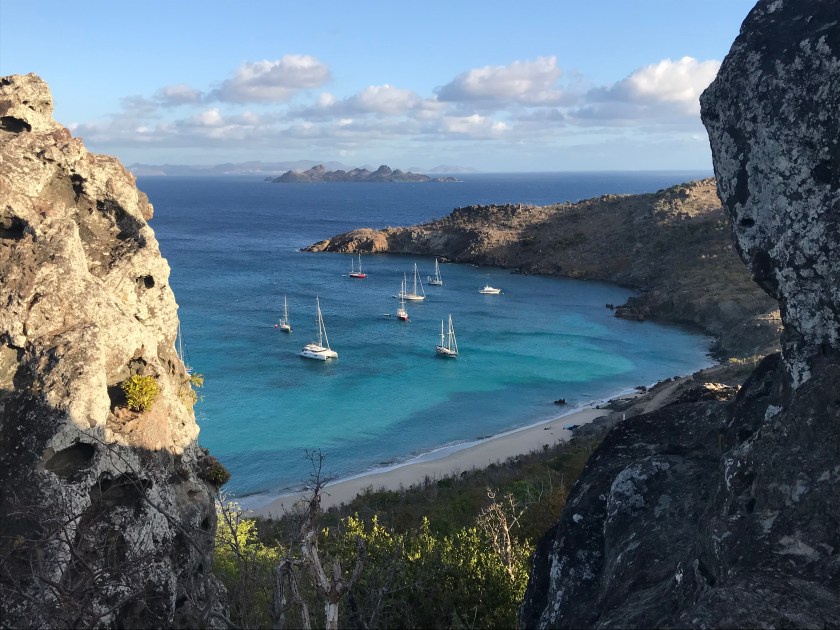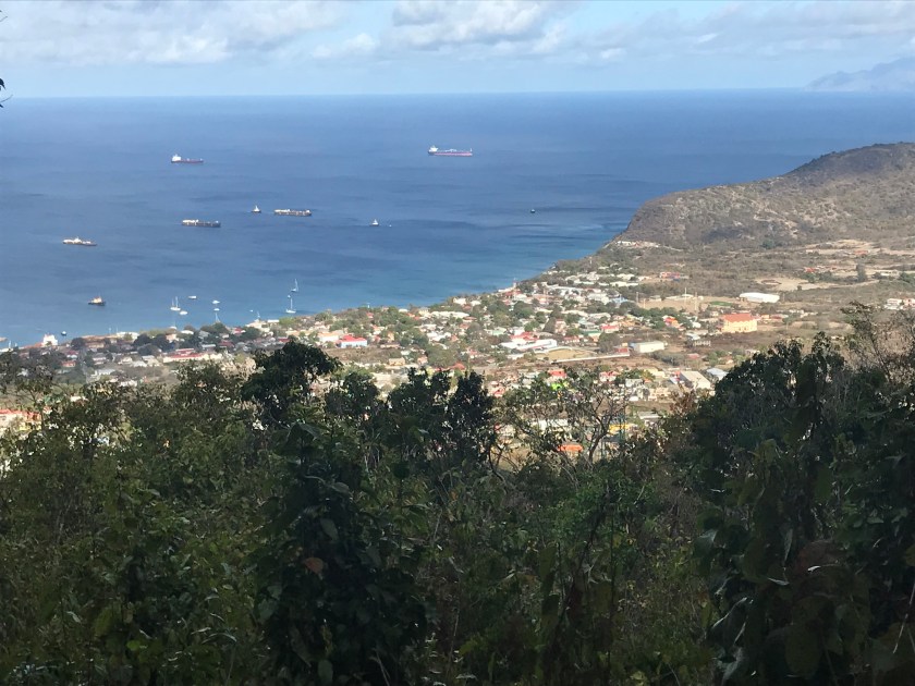 Statia anchorage from The Quill. You can spot us from the two masts. And those ships are mostly fuel barges (or ship equivalent of petrol pumps).