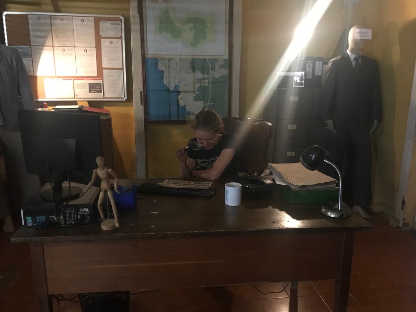 The police station itself is a permanent set and is exactly as it looks on film. The girls took a turn at JP’s, Florence’s and the Inspector’s desks and had a good rummage through their drawers.