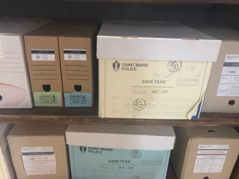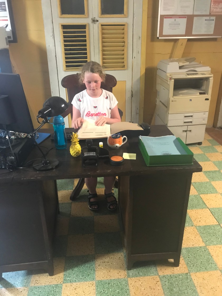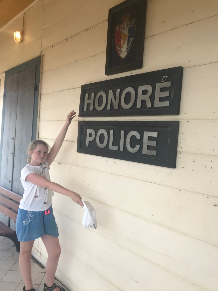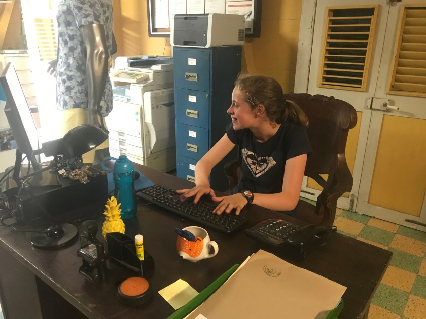 Daisy with the Inspector’s magnifying glass. Behind her on the wall is the map of St Marie (v similar to the butterfly shaped Guadeloupe) with all the rivers and place names written on.