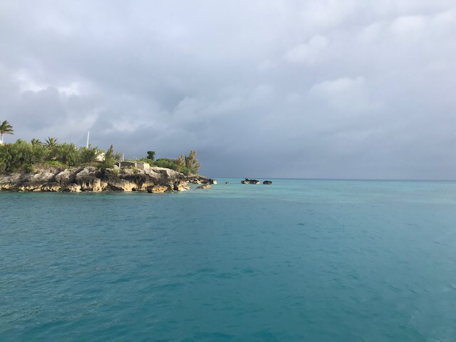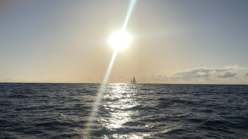 After getting clear of the lee of the island we hoisted the main and mizzen, rolled out the genoa and had the most wonderful afternoon beam reaching North in a 10-12kt Easterly as we passed Anguillita (the tiny island off the SW corner of Anguilla) and then between Dog and Prickly Pear Cays and out of the Caribbean two months after we arrived in Martinique. A small group of dolphins appeared to jump around in and out of the bow wave, reminding us of how much we’d enjoyed their company on the way across. Late in the afternoon we were overtaken by the long legged ‘Morpheus’ also heading for Bermuda, 850M ahead. The Atlantic was in a gentle mood that evening, a nearly full moon rising into the clear sky just before sunset meaning that it hardly got dark at all.